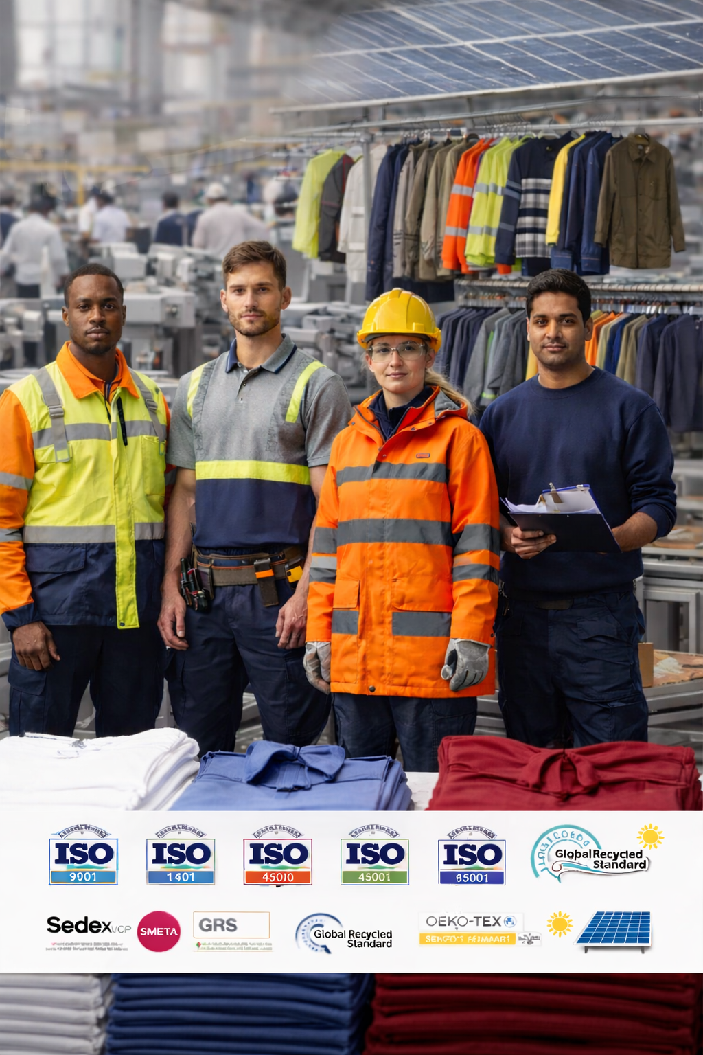 Our facilities are certified with ISO 9001, ISO 14001, and ISO 45001. We also comply with SEDEX/SMETA, GRS, and OEKO-TEX standards. Supported by solar energy, our production reflects a commitment to sustainability and responsible manufacturing.